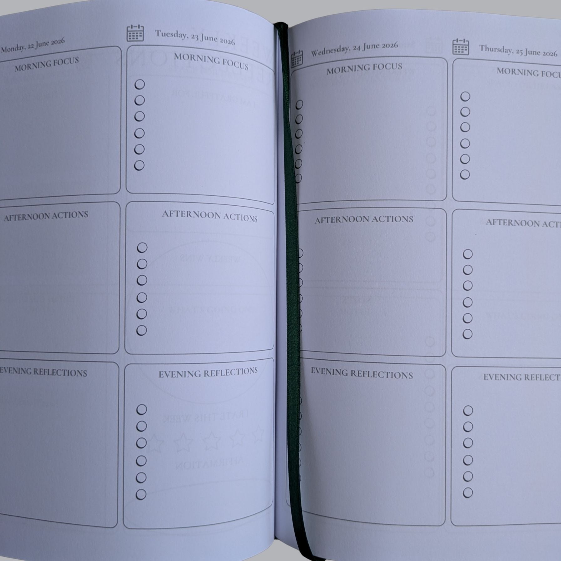 Green represents renewal and harmony, creating the perfect companion for documenting personal development and life's transitions. This refreshing colour promotes mental clarity and helps reduce overwhelm, making it ideal for processing daily experiences and finding balance in your weekly reflections. Green naturally inspires hope and forward movement in your personal record-keeping.